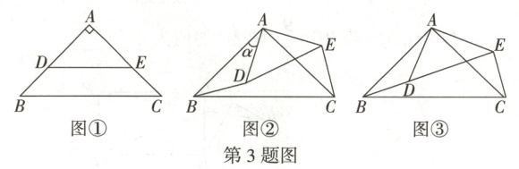 3. 把两个等腰直角△ABC 和△ADE 按如图①所示的位置摆放,∠A = 90°,将△ADE 绕点 A 按逆时针方向旋转,如图②,连接 BD,EC,设旋转角为 α (0° < α < 360°).