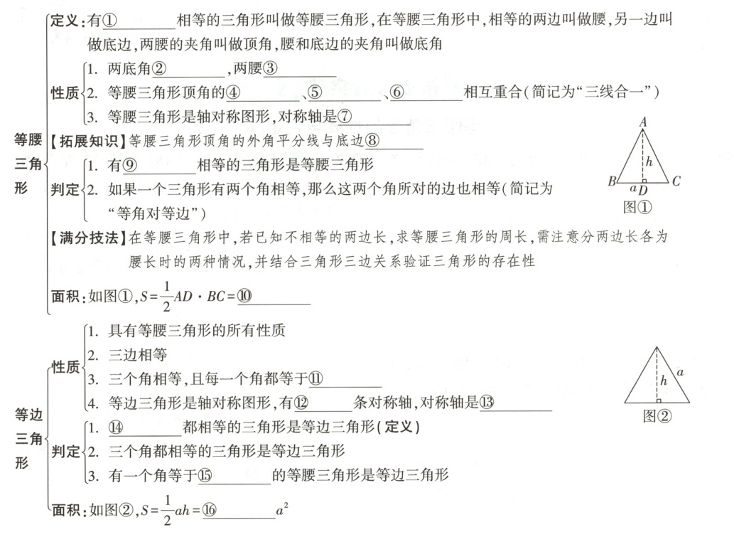 ①两边 ②相等 ③相等 ④平分线 ⑤底边上的中线 ⑥底边上的高 ⑦底边上的中线(或底边上的高或顶角的平分线)所在的直线 ⑧平行 ⑨两边 ⑩$\frac{1}{2}ah$ ⑪60° ⑫三 ⑬各边上的中线、高或角平分线所在的直线 ⑭三边 ⑮60° ⑯$\frac{\sqrt{3}}{4}$