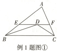 (2)如图①,过点$D$作$EF// BC$,分别交$AB$,$AC$于点$E$,$F$。求证:$\triangle AEF$的周长$= AB + AC$;