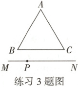练习 3 如图,$\triangle ABC$是等边三角形,直线$MN// BC$,点$P$在直线$MN$上运动,当点$P$与$\triangle ABC$的两个顶点的距离相等时,警报器就会发出警报,则在直线$MN$上会发出警报的点有(