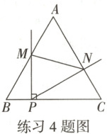 练习 4 如图,在等边$\triangle ABC$中,$AB = 10$,$P$为$BC$上一点(不与点$B$重合),过点$P$作$PM\perp BC$于点$P$,交线段$AB$于点$M$,将$PM$绕点$P$顺时针旋转$60^{\circ}$,交线段$AC$于点$N$,连接$MN$,有三位同学提出以下结论: