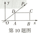 10. 如图,在平面直角坐标系中,矩形$ABCD$的边$AB$在$x$轴的正半轴上,点$D(4,3)$,$B(10,0)$,过点$D$的正比例函数$y = kx$图象上有一点$P$,$D$为$OP$的中点,将$y = kx$的图象沿$y$轴向下平移得到$y = kx + b$的图象,若点$P$落在矩形$ABCD$的内部,则$b$的取值范围是(