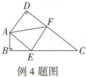 例4 解:如解图,作点$A$关于$BC$和$CD$的对称点$A'$,$A''$,连接$BA'$,$DA''$,$A'A''$,$A'A''$分别交$BC$于点$E$,交$CD$于点$F$,则$\triangle AEF$的周长为$AE + EF + AF = A'E + EF + A''F\geqslant A'A''$,当$A'$,$E$,$F$,$A''$四点共线时,$A'A''$的长即为$\triangle AEF$周长的最小值.