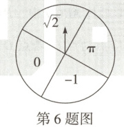 6. (2025样卷)如图,转盘被等分成四个扇形区域,并分别标有数字-1,0,$\sqrt{2}$,π.随机转动转盘两次,转盘停止后指针所指区域的数字都是有理数的概率是(指针固定向上,当指针恰好指在分界线上时按指针左侧相邻区域算)(