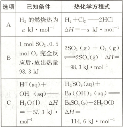 ΔH=-98.3 kJ·mol⁻¹,故B项错误;硫酸根离子、钡离子之间的反应放热,H₂SO₄(aq)+Ba(OH)₂(aq)=
