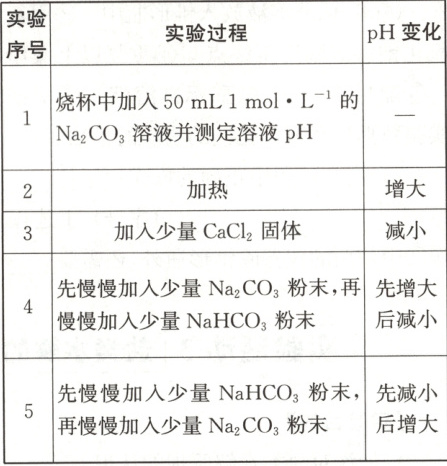 (2)加入$Na_{2}CO_{3}$粉末,溶液中$c(CO_{3}^{2-})$增大,水解平衡$CO_{3}^{2-} + H_{2}O ⇌ HCO_{3}^{-} + OH^{-}$右移,溶液中$c(OH^{-})$增大,pH增大;加入$NaHCO_{3}$粉末,溶液中$c(HCO_{3}^{-})$增大,水解平衡$CO_{3}^{2-} + H_{2}O ⇌ HCO_{3}^{-} + OH^{-}$左移,溶液中$c(OH^{-})$减小,pH减小