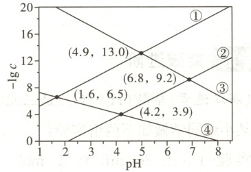 4.D 解析 $H_2S$ 为弱电解质, 分步电离, 随 $pH$ 增大, $HS^-$、$S^{2-}$ 均应逐渐增大, 且 $pH$ 较小范围内 $-\lg c(S^{2-})$ 比 $-\lg c(HS^-)$ 大, 故 ③ 为 $pH$ 与 $-\lg c(S^{2-})$ 的关系曲线, ④ 为 $pH$ 与 $-\lg c(HS^-)$ 的关系曲线; 已知 $K_{sp}(NiS) > K_{sp}(CdS)$, 则 ①、② 分别为 $pH$ 与 $-\lg c(Cd^{2+})$、$-\lg c(Ni^{2+})$ 的关系曲线; 根据 $(4.9, 13.0)$ 点可知, $K_{sp}(CdS) = c^2(Cd^{2+}) = (1 × 10^{-13})^2 = 1 × 10^{-26}$, A 项错误。根据上述分析 ③ 为 $pH$ 与 $-\lg c(S^{2-})$ 的关系, B 项错误。根据图中 $(4.2, 3.9)$ 可知, $K_{a_1} = \frac{c(H^+) · c(HS^-)}{c(H_2S)} = \frac{10^{-4.2} × 10^{-3.9}}{0.1} = 10^{-7.1}$, C 项错误。由曲线上 $(6.8, 9.2)$ 列式可得: $K_{a_2} = \frac{c(S^{2-}) · c^2(H^+)}{c(H_2S) · K_{a_1}}$, $K_{a_2} = \frac{c(S^{2-}) · c^2(H^+)}{c(H_2S) · K_{a_1}} = \frac{10^{-9.2} × (10^{-6.8})^2}{0.1 × 10^{-7.1}} = 10^{-14.7}$, D 项正确。