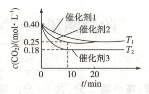 13.CD 解析 催化剂只改变化学反应速率,不影响平衡移动,该反应的正反应为放热反应,升高温度,平衡逆向移动,平衡时c(CO₂)较大,根据图知,T₁温度下平衡时c(CO₂)大于T₂温度下平衡时c(CO₂),则温度:T₁>T₂,故A项正确;T₁下反应达到平衡时,c(CO₂)=0.25mol·L⁻¹,消耗的c(CO₂)=(0.40−0.25)mol·L⁻¹=0.15mol·L⁻¹,根据热化学方程式知,生成的c(CH₃OH)等于消耗的c(CO₂),为0.15mol·L⁻¹,故B项正确;其他因素完全相同,只有催化剂不同时,催化剂的活化能越小,反应速率越大,反应达到平衡的时间越短,曲线的斜率越大,根据图知,催化剂2的反应速率大于催化剂1的反应速率,则使用催化剂1的反应活化能比催化剂2的大,故C项错误;其他因素完全相同,只有催化剂不同时,催化剂不同,反应历程不同,使用催化剂2和催化剂3反应达到平衡的时间不同,所以使用催化剂2和催化剂3的反应历程不同,故D项错误。