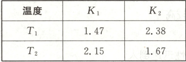19. (12 分)已知化学反应①:${Fe(s) + CO_{2}(g){<=>}FeO(s) + CO(g)}$,其平衡常数为 $K_{1}$;化学反应②:${Fe(s) + H_{2}O(g){<=>}FeO(s) + H_{2}(g)}$,其平衡常数为 $K_{2}$。在不同温度 $T$ 下 $(T_{1}<T_{2})$,$K_{1}$、$K_{2}$ 的值如下表所示: