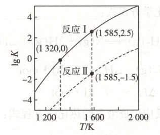(1)已知 $K_{p}=(p_{{CO}})^{n}$、$K=(\dfrac{p_{{CO}}}{10^{5}\ Pa})^{n}$ ($n$ 是 ${CO}$ 的化学计量数)。反应Ⅰ、Ⅱ的 $\lg K$ 与温度的关系曲线见图 $1$。