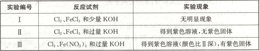 ②实验Ⅱ中,$c(\mathrm{Cl^-})$浓度大,$\mathrm{Cl_2}$的氧化性减弱,不利于反应$3\mathrm{Cl_2}+2\mathrm{Fe^{3+}}+16\mathrm{OH^-}\longrightarrow2\mathrm{FeO_4^{2-}}+6\mathrm{Cl^-}+8\mathrm{H_2O}$的进行