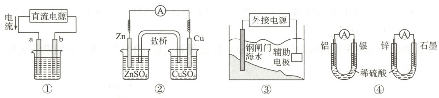 3.A 解析图①,根据装置图中电流方向可知,a电极为阳极、b电极为阴极,铁上镀铜时,Cu为阳极、Fe为阴极,电解质溶液可以是CuSO₄溶液,A项正确。图②,双液铜锌原电池中,Zn为负极、Cu为正极,原电池工作时:阳离子移向正极、阴离子移向负极,即盐桥中KCl的K⁺移向正极,移向右烧杯,B项错误。图③装置是利用电解原理防止钢闸门生锈,即外加电流法,其中钢闸门接外加电源的负极,作阴极,发生得电子的还原反应,C项错误。图④中两装置均为原电池,正极反应均是2H⁺ + 2e⁻ = H₂↑,通过导线的电子数相同时,正极析出产品的物质的量相同,D项错误。