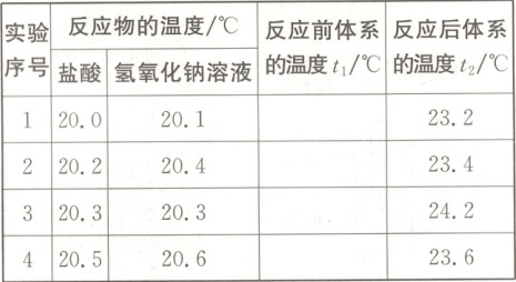 (5)假设盐酸和氢氧化钠溶液的密度都是1g·cm⁻³,又知中和反应后生成的溶液的比热容c=4.18J·(g·℃)⁻¹。为了计算中和热,某学生的实验数据如表所示。