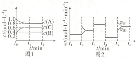1 mol;$K_1=\frac{c^3(\mathrm{C})}{c(\mathrm{B})·c^2(\mathrm{A})}=\frac{0.6^3}{0.4×0.8^2}$。通过图2可看出