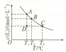 $T_1$时,反应进行到状态D时,$c(\mathrm{I_3^-})$小于平衡时浓度,则平