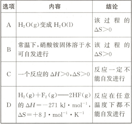 A 解析根据△G=△H-T△S判断,对于△H<0、△S>0的反应,在任何温度下△G<0,反应均能自发进行,A项错误;反应MgCl₂(l)⇌Mg(l)+Cl₂(g)为通电条件下发生的分解反应,故为吸热反应,则△H>0,反应物无气体,生成物有气体,则△S>0,B项正确;反应NH₃(g)+HCl(g)=NH₄Cl(s)的△S<0,在室温下可自发进行,则△G=△H-T△S<0,则该反应的△H<0,C项正确;该反应的△H>0,由于该反应是固体反应物生成气体,△S>0,则该反应在一定条件下能自发进行,原因是体系有自发地向混乱度增加的方向转变的倾向,D项正确。