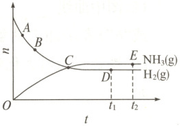 8. 合成氨工业对国民经济和社会发展具有重要的意义。对于密闭容器中的反应${N_{2}(g) + 3H_{2}(g)\rightleftharpoons 2NH_{3}(g)}$ $\Delta H < 0$,$673\ K$、$30\ MPa$下,$n({NH_{3}})$和$n({H_{2}})$随时间的变化关系如图所示。下列说法正确的是(