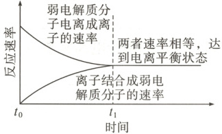 在一定条件下$($如温度和浓度$),$弱电解质分子电离成离子的速率和离子结合成分子的速率_时,电离过程达到电离平衡状态。如图所示: