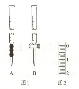 中仪器_(填“A”或“B”)取待测烧碱溶液 25.00 mL 放入锥形瓶中,滴加 2 滴酚酞作指示剂。(2) 记录盛装 $ 0.1000 \ mol · L^{-1} $ 盐酸标准溶液的酸式滴定管的初始读数。如果某时刻液面位置如图 2 所示,则此时的读数为_