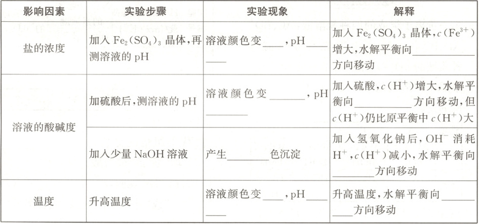 。2. 实验探究外界因素对Fe₂(SO₄)₃水解平衡Fe³⁺ + 3H₂O ⇌ Fe(OH)₃ + 3H⁺的影响,根据实验操作填写下表。