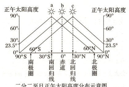 向南北两侧递减,如图中 a 折线所示。③ 春、秋分日:正午太阳高度由