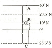 C 点($ 23.5^{\circ}S $)正午太阳高度为 $ H = 90^{\circ} - B、C $纬度差 $ = 90^{\circ} - (10^{\circ} + 23.5^{\circ}) = 56.5^{\circ} $。