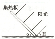 太阳能热水器的集热板要根据正午太阳高度的季节变化来调整角度,集热板与地面之间的夹角 $ \alpha $ 应等于当天正午太阳高度的余角。如图所示,$ \alpha + H = 90^{\circ} $ 时效果最佳。太阳能热水器的安装倾角 = 两点纬度差(即当地纬度和太阳直射点纬度的差值)。