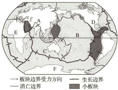 A板块,B 太平洋板块,C板块、D 美洲板块、E 非洲板块、F板块。