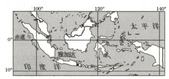 2022 年 12 月 4 日,印度尼西亚爪哇岛东部塞梅鲁火山喷发,大量黑色火山灰喷发到 1500 米的高空。下图为“印度尼西亚简图”。完成 1 ~ 2 题。
