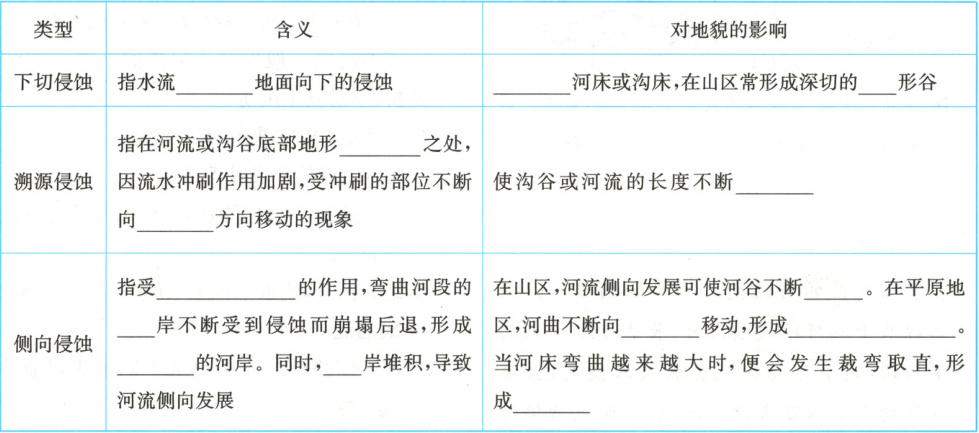 垂直;加深;V;陡峭;源头;延长;弯道环流;凹;陡峭;凸;展宽;两侧;蛇曲;牛轭湖