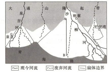 青海湖是我国最大的咸水湖,四周高山环抱,常年盛行北风。湖北岸发育有许多冲积扇,尤以沙柳河(落差 1500 米、长度 105.8 千米、流域面积 1442 平方千米)和泉吉河(落差 1108 米、长度 65 千米、流域面积 567 平方千米)形成的冲积扇最典型,两冲积扇与湖水接触的扇缘处均发育完整扇形。下图示意青海湖北岸冲积扇分布。