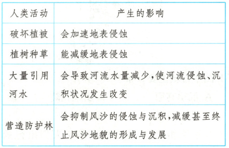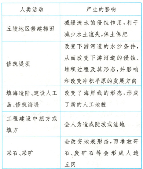 。例如,填海造陆、开挖河道、修筑梯田、修建水库等。人类活动不断地塑造着新的地表形态。[核心归纳] 人类活动对地表形态的影响