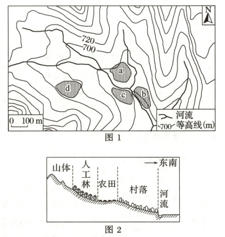 某地(图 1)位于太行山南段东麓,该地山势险峻,多暴雨,易发山洪。为适应当地地理环境,该地形成了西北—东南向的“山—林—田—村—水”空间格局(图 2),展现了当地居民的生存智慧。据此完成 1~3 题。