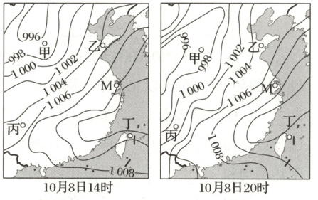 1.D 2.B [第1题,读左图并根据等压线的分布可知,14时,乙地区东南方向气压高于西北方向,水平气压梯度力垂直于等压线并由高压指向低压即由东南指向西北,在地转偏向力及摩擦力的共同作用下,风向向右偏转为偏南风,D正确。第2题,读右图可知,20时,图中M处和甲地风向均为东南风,其中M处由于等压线更密集,水平气压梯度力更大,且风从海洋吹来,摩擦力较小,因此风力更大,B正确。]