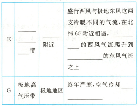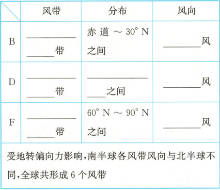 ②东北信风 东北 盛行西风 30°N~60°N 西南 极地东风 东北