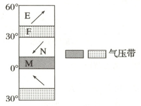 1.A 2.B [第1题,图中气压带和风带位置偏北,为北半球的夏季。图中M气压带位于赤道附近,为赤道低气压带;F位于30°N附近,为副热带高气压带;N位于副热带高气压带和赤道低气压带之间,为北半球的东北信风带;E为盛行西风带,A正确。第2题,热带雨林气候全年受赤道低气压带控制,B正确。]