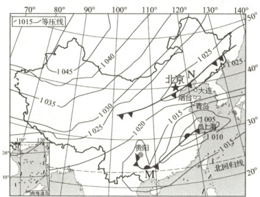 1. 分析图中M、N锋面的共同特征。