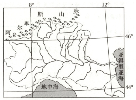 下图为“世界某河流流域示意图”(图中虚线为流域界线)。据此完成 1~2 题。