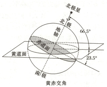 ①地轴总是与赤道面垂直,地轴与黄道面之间的夹角约66.5°,与黄赤交角互余。