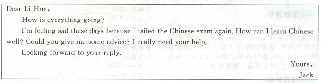 One possible version:Dear Jack,I’m glad to receive your email. I know that you have trouble with your Chinese. Here is some advice for you.First of all, you can watch Chinese movies to improve your Chinese. Then you can practice pronunciation by reading aloud. What’s more, when you are in trouble, you can ask your teachers for help. Your teachers are always happy to help you. Last but not least, it’s a good idea to speak Chinese as much as possible. You can practice Chinese with your classmates after class. By the way, don’t be afraid of making mistakes. You can learn a lot from mistakes.I really hope my suggestions can be of help.Yours,Li Hua