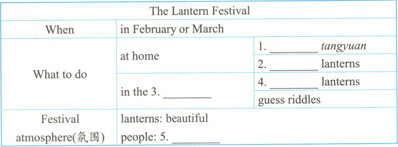 After dinner, people usually go out and watch lanterns in the park. We can find big lantern shows there. We can guess riddles in the park too. People always have a good time at this festival.