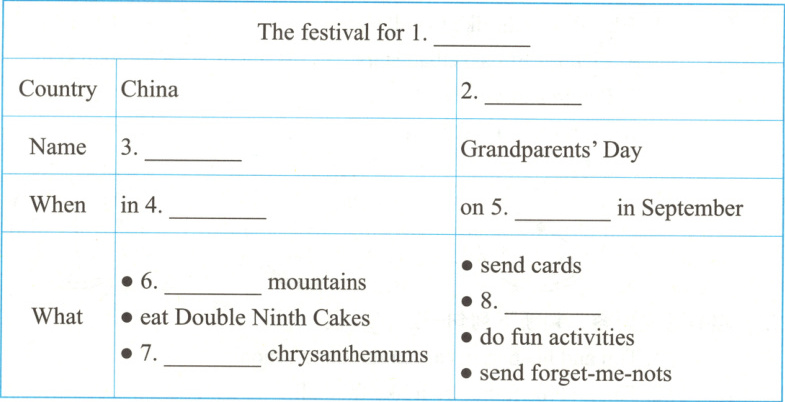 There is a festival for old people in the US too. It’s Grandparents’ Day. It’s on the first Sunday in September. People always send cards, give gifts and do fun activities. Some people also send flowers called forget-me-nots.