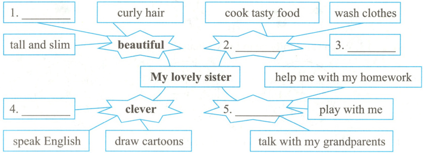I have a lovely sister. My sister is beautiful. She is tall and slim. She has small eyes and short curly hair. My sister is helpful at home. She can cook tasty food for my family. She can wash clothes. She can clean the rooms. My sister is clever. She can play the erhu. And she can speak English fluently. She can draw cartoons well. My sister is kind. She often plays with me. She helps me with my homework. She often talks with my grandparents. This is my sister. We all love her very much.