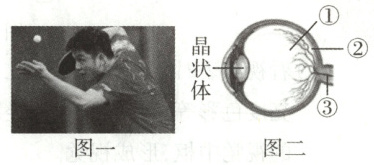 8. 乒乓球运动员樊振东在 2024 年巴黎奥运会中实现了个人职业生涯的“大满贯”。图一为樊振东击球的某一瞬间,图二为人的眼球结构示意图。下列相关叙述错误的是(