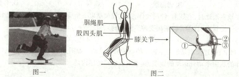 (填“收缩”或“舒张”)状态。(2)滑板运动强度大,为减少对膝关节的损伤,应佩戴护膝,其功能与图二中的[①]