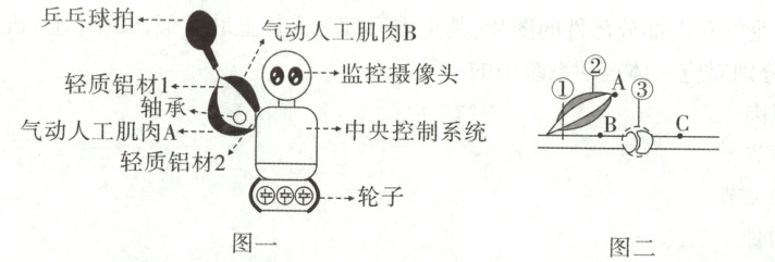 (填“B”或“C”)上。(3)当乒乓球飞来时,监控摄像头将信息传到中央控制系统,中央控制系统控制气动人工肌肉 B