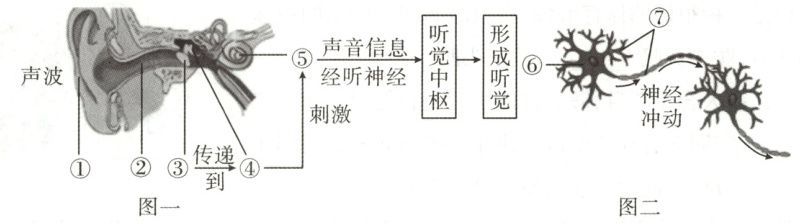 中的听觉中枢,形成听觉。(3) 经检查,某人耳的结构完整无损伤,但近半年他逐渐听不见声音了。根据图一分析,可能是