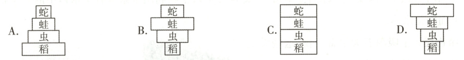 9. 长期被镉污染的稻田中存在这样一条食物链:稻→虫→蛙→蛇。若以方框大小代表镉积累量的多少,则下列最能体现该食物链中各生物体内镉积累量关系的是 (
