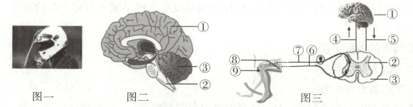 (填序号)内有调节心跳、呼吸、血压等基本生命活动的中枢,所以佩戴头盔能有效降低摩托车、电动自行车事故的死亡率。(3)某人在骑行过程中未佩戴头盔,导致头部受伤。医生通过膝跳反射检查其神经系统是否受损,请用数字和箭头表示图三中完成膝跳反射的反射弧组成: