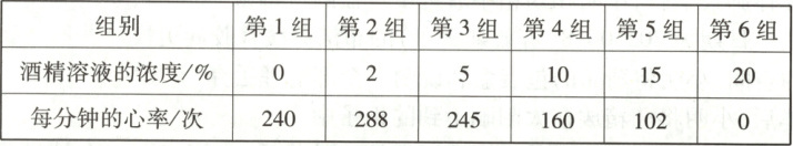 13. 酗酒是当今社会的三大公害之一。为模拟探究酒精对人体的危害,生物小组选用 30 只个体大小、生理状态一致的成年水蚤并分为 6 组,分别放在不同浓度的酒精溶液中测量水蚤的心率,且每组实验都重复测量 3 次并计算其平均值,将数据填写在下表中。
